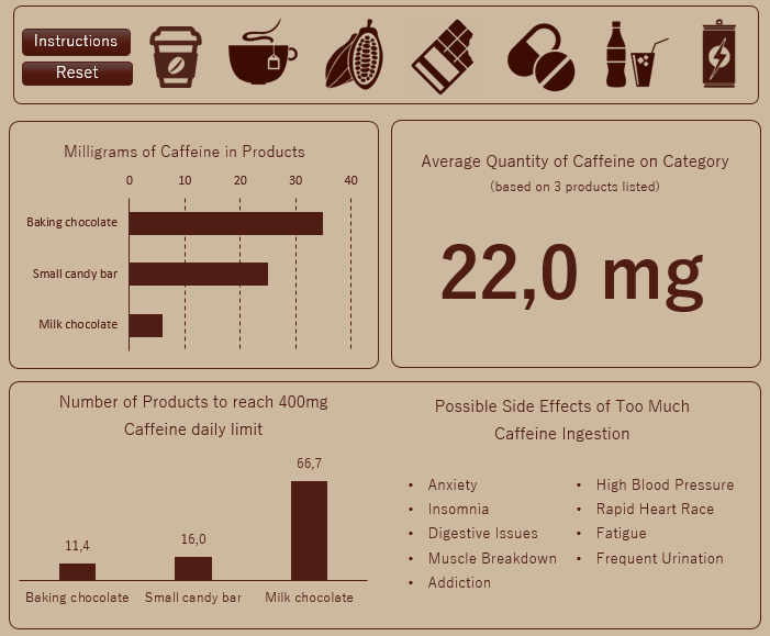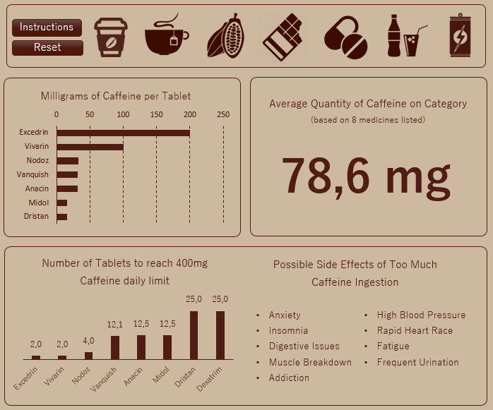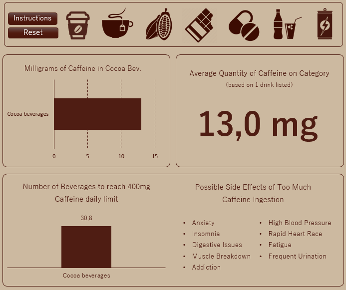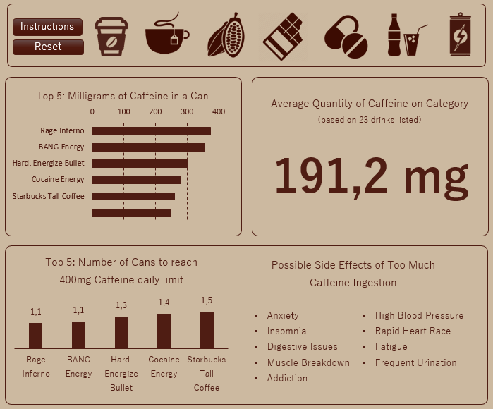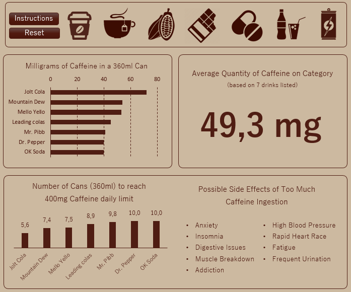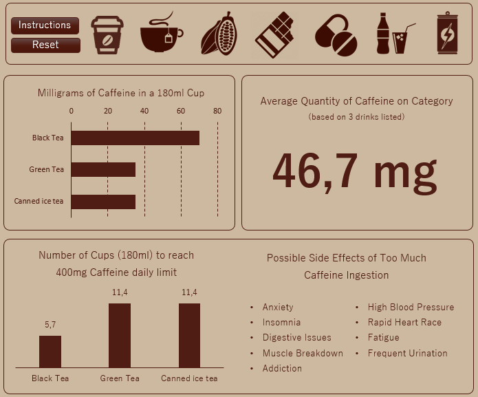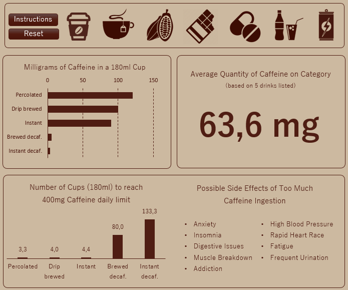 In the specific blocks we can see the differences between drinks in the same category, as well as check the average quantity based on the itens listed. In the bottom chart we see how many cups we can ingest before reaching the 400 mg maximum, for example: only 3 Percolated are enough, while we’d have to spend a long time drinking 133,3 Instant Decaffeinated in order to reach the “goal”.