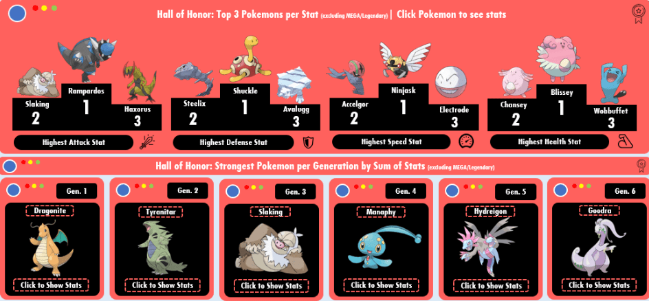 Now, about the Halls of Honor below. They basically display the best pokemons according to specific stats (Attack, Defense, Speed and HP) and by generation (sum of all stats).