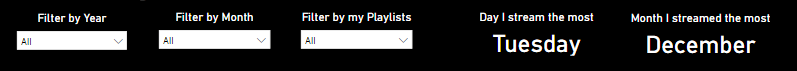 Using the dates column, I could build slicers to filter year (2019, 2020) and month, while using the playlists table I could slice by playlists. With those slicers, we can find more specific data and open up more results possibilities in the board.