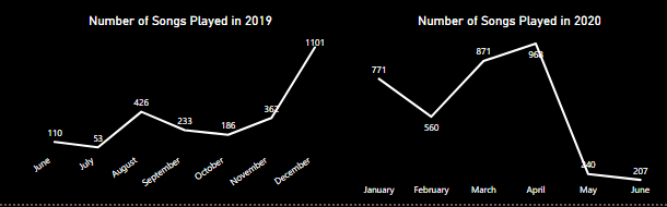 - 2 line charts (2019 and 2020) showing the number of songs I played by month