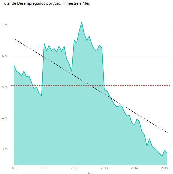 Com os dados que temos, podemos analisar o desemprego de algumas perspectivas diferentes. Na visualização principal utilizei um gráfico de área para demonstrar o número de pessoas desempregadas entre 2010 e 2015, deixando também dados trimestrais e mensais (obtidos quando passamos o mouse pela linha). Ainda também adicionei uma linha de média (vermelha) e uma linha de tendência (Preta).