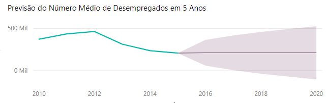 Utilizando a ferramenta de previsão do Power BI, crei uma visualização para nos dar uma ideia do comportamento desses números nos próximos 5 anos, vejamos abaixo: