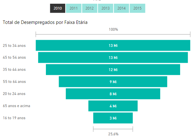 Já a terceira visualização traz os números por faixa etária e por ano de maneira diferente do que mostrado no gráfico de área. O gráfico funil “empilha” os valores de cada categoria do maior para o menor, considerando o maior como 100%. Ele é interessante para compararmos as categorias e enxergarmos melhor as diferenças entre elas de um ano para o outro (trocando a seleção de ano no slicer acima dele).