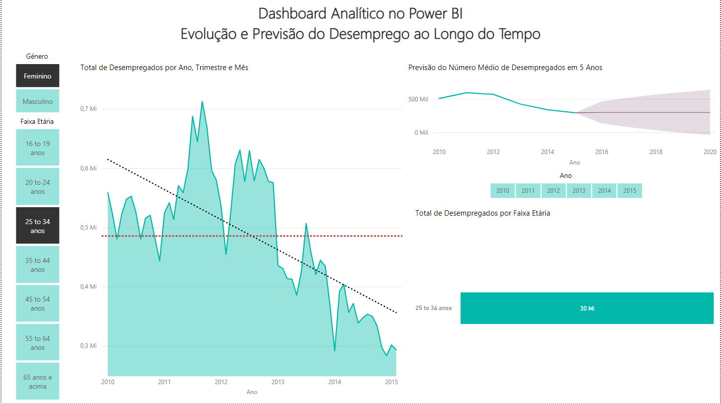 Nesse post trago um dashboard composto por 3 gráficos e alguns filtros, onde vemos como o número de desempregados se comportou durante o intervalo de 5 anos, como ele tende a se comportar pelos próximos 5, e como esteve distribuído entre as faixas etárias ativas da sociedade.