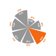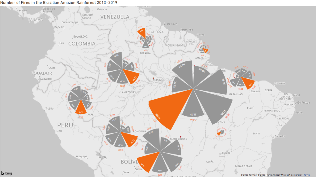 The thing is that Power BI doesn’t have a Rose Chart visualization, so what do we do? Create it somewhere else and import to Power BI! With the Youtube guidance I was able to create the chart on Charticulator and then just put the information and adjust the ratios while in Power BI. The chart reads as X Axis = Years, Bars = # of Firespots, Highlighted Bar = Year with the highest number of firespots.