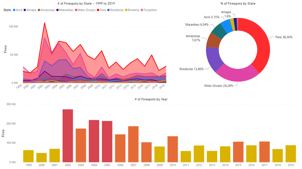 - The states with the largest numbers (Pará and Mato Grosso) are know for having two very destructive economic activities: Mining and Cattle, respectively. Both need the forest to be destroyed so they can exist, so, many people ilegally burn/cut down the forest in order to expand their “working” areas. States like Rondônia, Acre and Amazonas suffer from the same problem, but in lesser aggression.